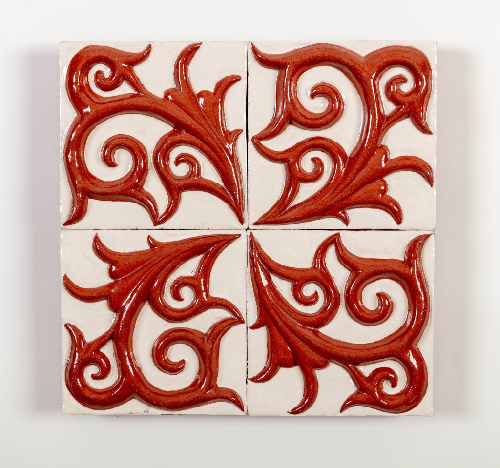 High-relief terracotta tiles with white slip and glaze mounted on wooden backing board (floating)